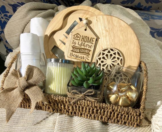 Cheeseboard with stainless steel tools, two wine glasses with coasters, a soy-scented candle, two cotton napkins and a potted plant with a wooden word board and six chocolate hearts.