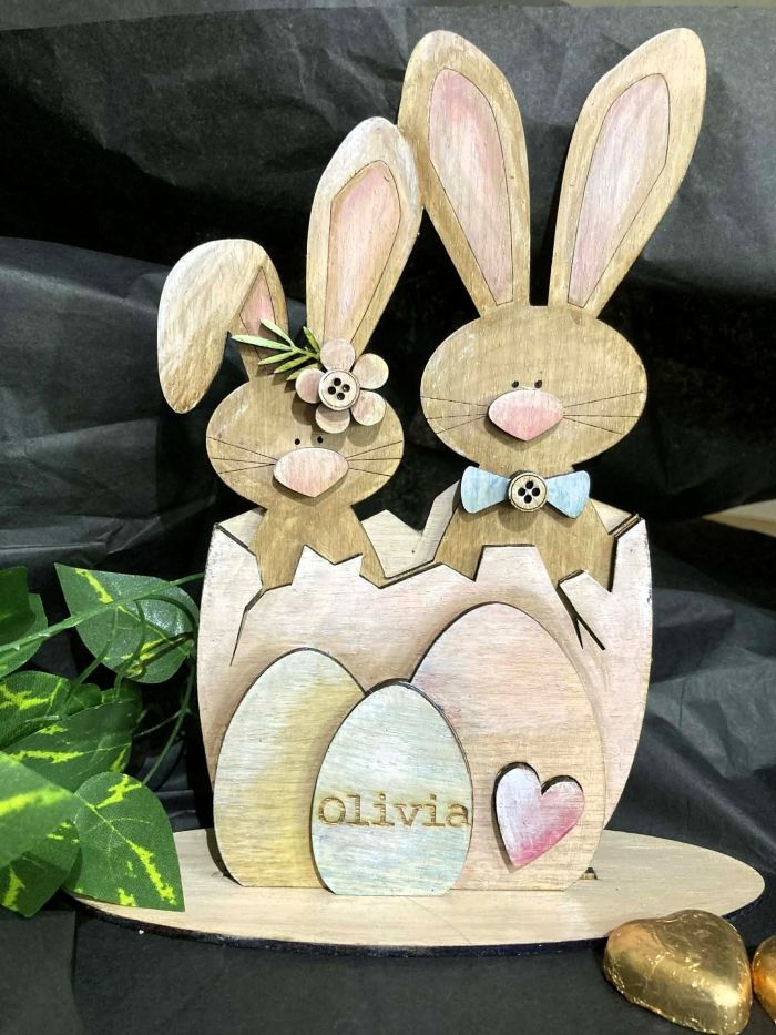 Handmade, layered veneer Easter Egg Bunnies. Stands approximately 25 cm.